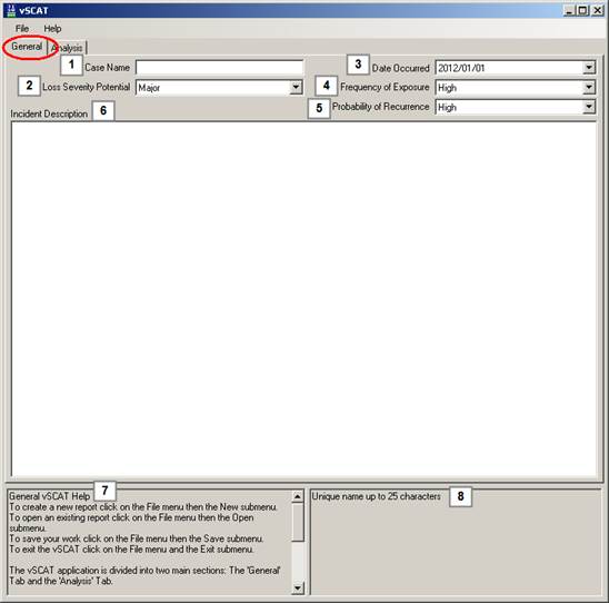 The General Tab collects the standard data required for the administrative details of the Incident Investigation. If vSCAT™ is being used in addition to another incident investigation system, the General tab can become the reference page or title page for the causal analysis section of the investigation.