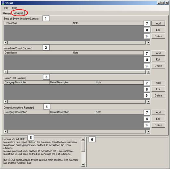 The Analysis tab is divided up into four sections. Each of these sections contains a list of options that can be selected to describe each stage of the Incident. These lists are hierarchical in nature and each entry in a given section directly relates to the entry in the section above it.