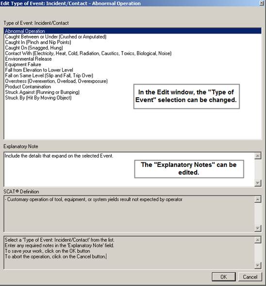 The SCAT Item detail is where you add the Type of Event: Incident/Contact, Immediate/Direct Causes, Basic/Root Causes, Corrective Actions Required. For each item that you add to your vSCAT™ record you can also add an Explanatory Note for added detail.