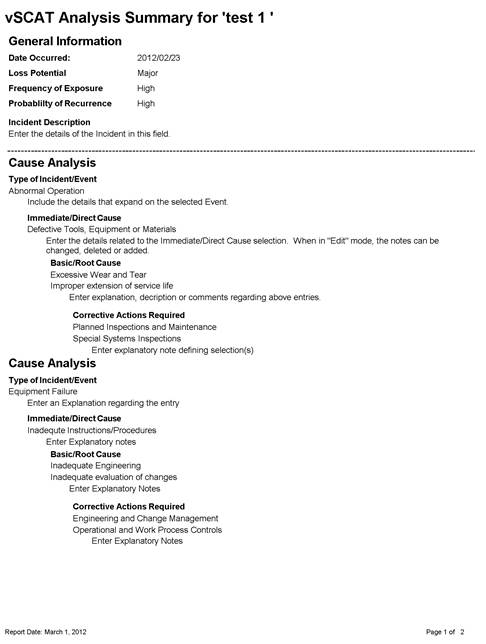 This software version of SCAT® allows you to use the causal analysis methodology that is the commonly accepted standard for Incident Root Cause Analysis. Many safety and risk management organizations have adopted this standard worldwide. vSCAT™ uses the standard created by DNV GL called Systematic Cause Analysis Technique or SCAT®. The Incident report is created and defined through the “General” tab and analysed, along with the SCAT® Charts, through the “Analysis” tab. The SCAT® Definitions and Help menu guide you through the process from the “Incident/Contact”, “Immediate/Direct Causes” (including Substandard Acts & Substandard Conditions), “Basic/Root Causes” (Including Job Factors and Personal Factors) to “Corrective Actions”. Comments can be included at each level defining the details of each specific factor. As there is always more than one cause for any Incident, you will be able to print a report defining each Causal Analysis String including Event, Direct Cause, Root Cause and subsequent Corrective Action related to the event you are investigating.